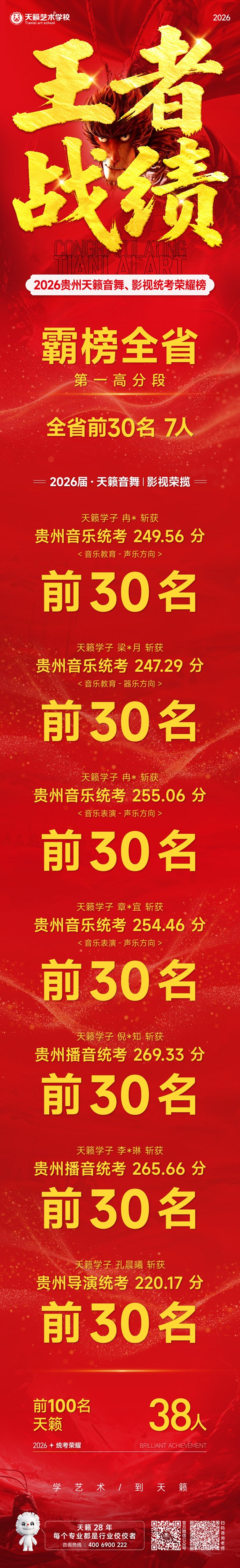 2026年贵州天籁艺术学校音舞影视传媒专业统考高分闪耀,全省第一高分段,贵州统考前30名,天籁7人,全省前100名,天籁38人。