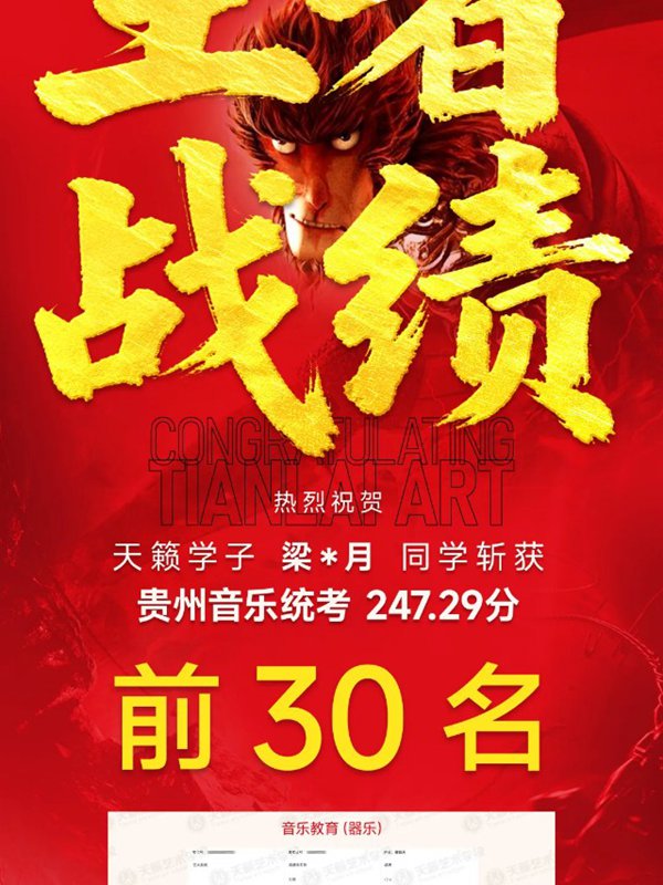 2026天籁学子梁*月247.29分斩获贵州音乐统考音乐教育-器乐 全省前30名