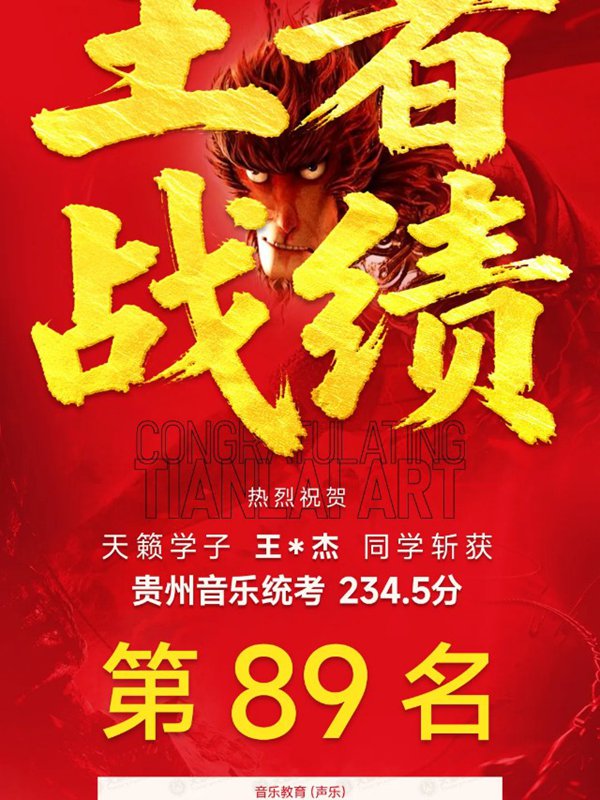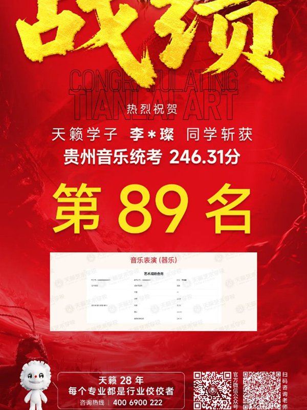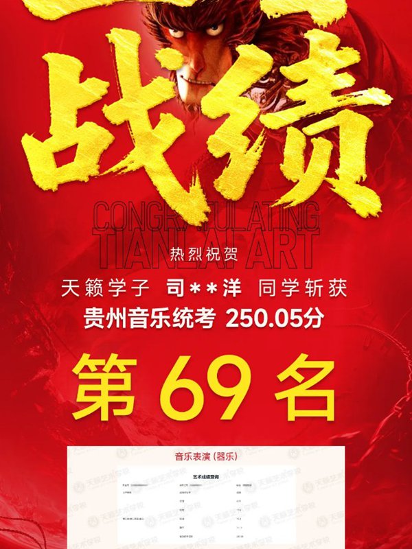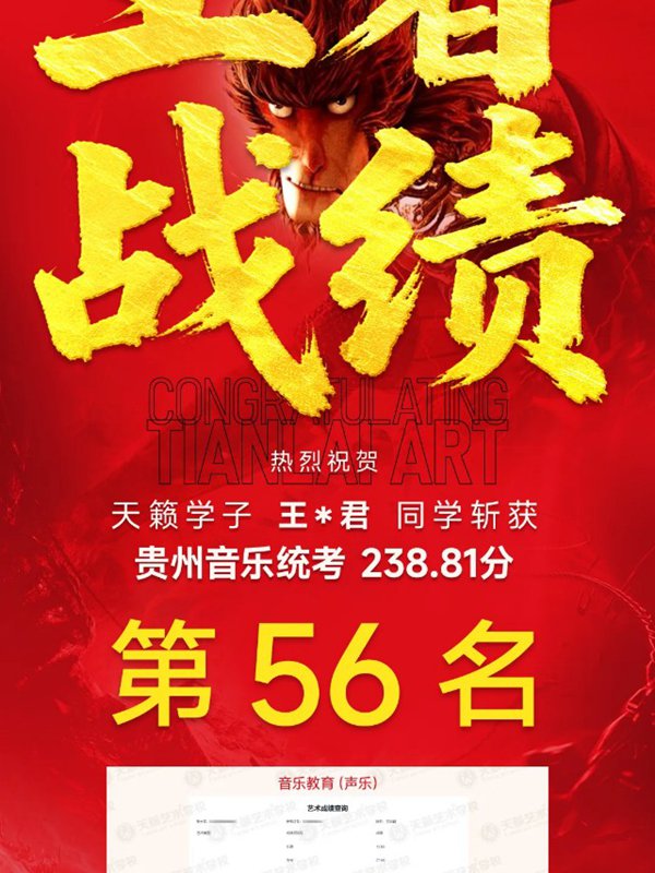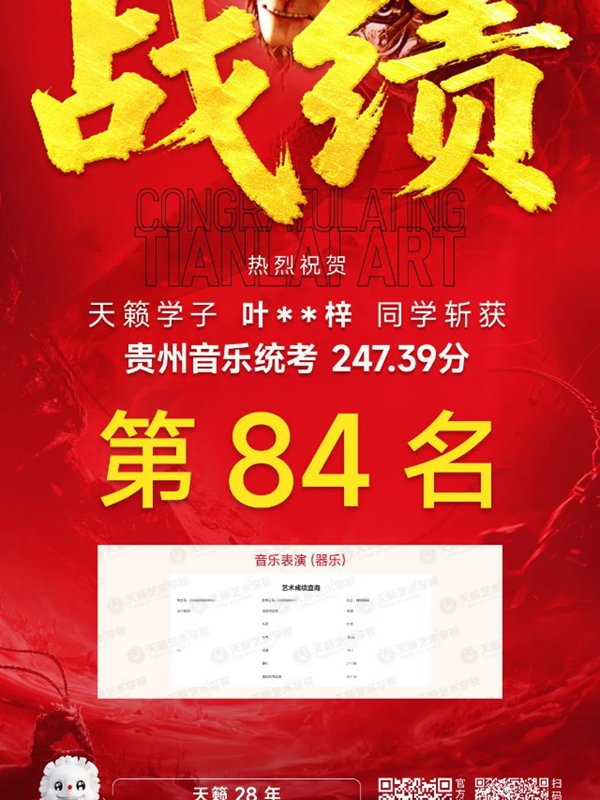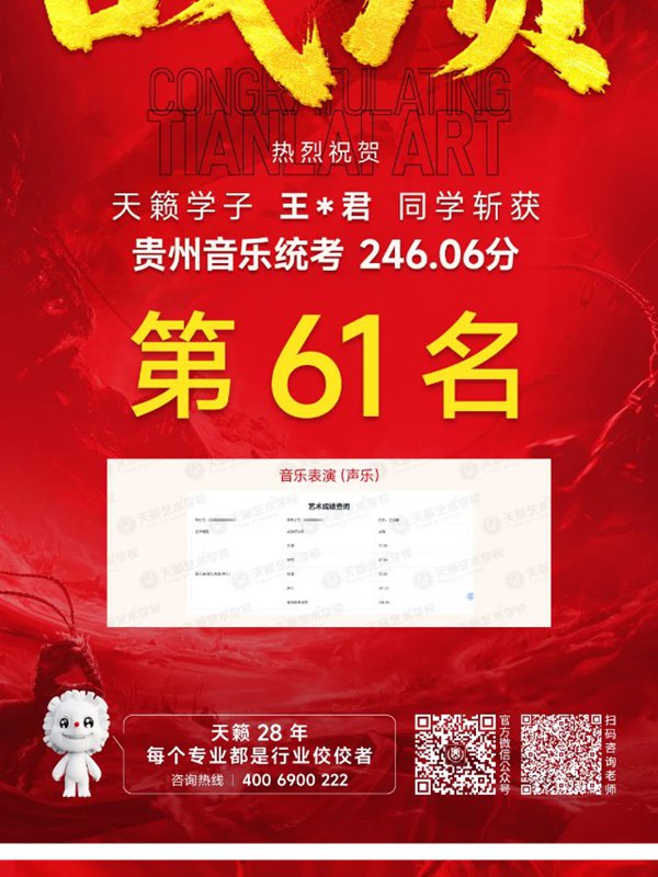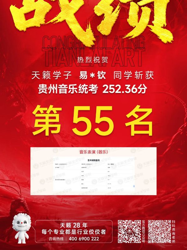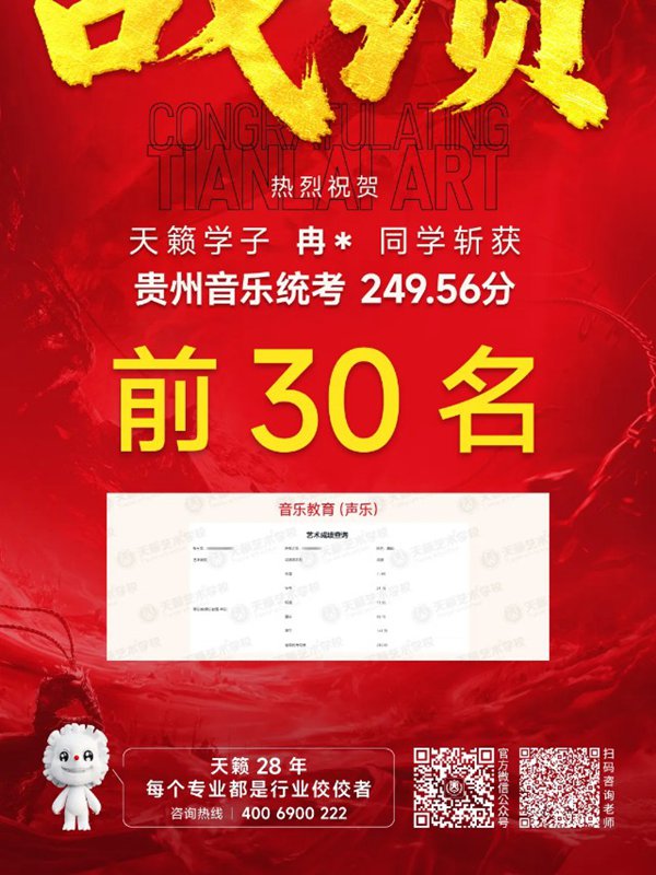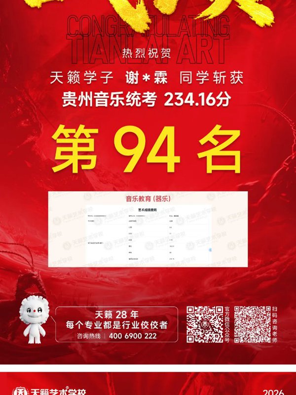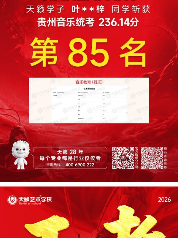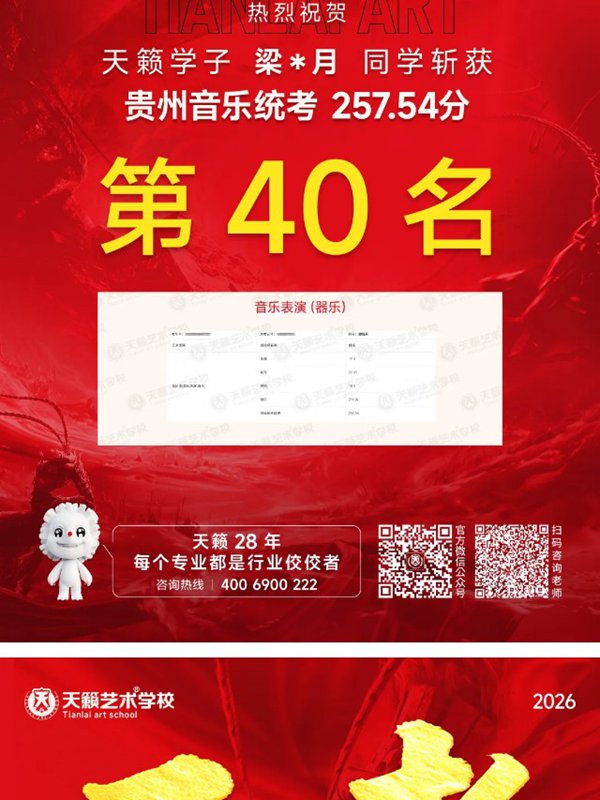 2026天籁学子章*宜254.46分斩获贵州音乐统考音乐表演-声乐 全省前30名