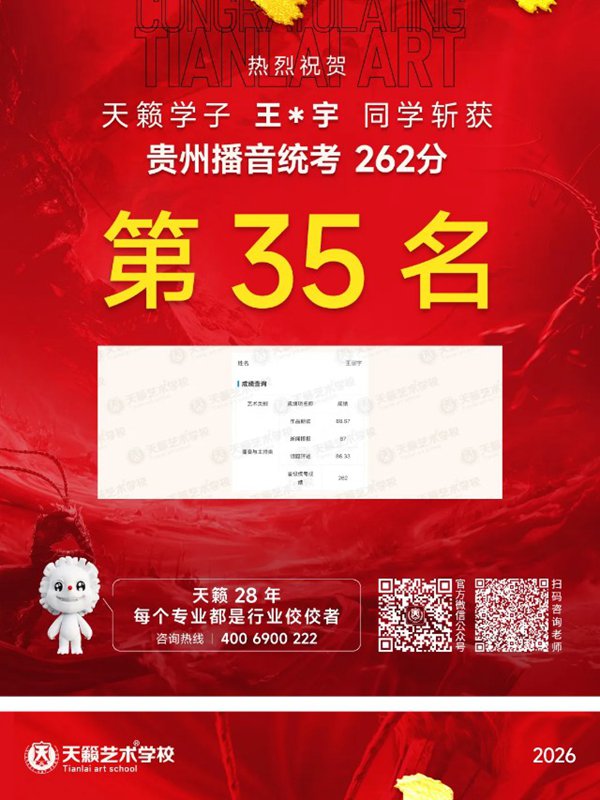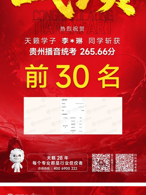 2026天籁学子李*琳265.66分斩获贵州播音统考 全省前30名